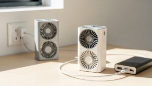 どちらのモデルも、ヒーター機能を使う際は最大1200W程度の電力を消費します。これは一般的な電気セラミックファンヒーターと同じですが、HP07はセンサーによって「部屋が暖まったら自動でパワーを落とす」制御がより細やかです。